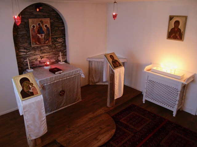There is a small chapel in the hermitage where Mother Mary mainly practises the Jesus Prayer with liturgical prayer at the weekends. Every couple of months she travels to Dunblane, Edinburgh and Glasgow to attend services, see her spiritual father, clergy and friends. Once a year she travels to stay at a monastery and attend a conference.